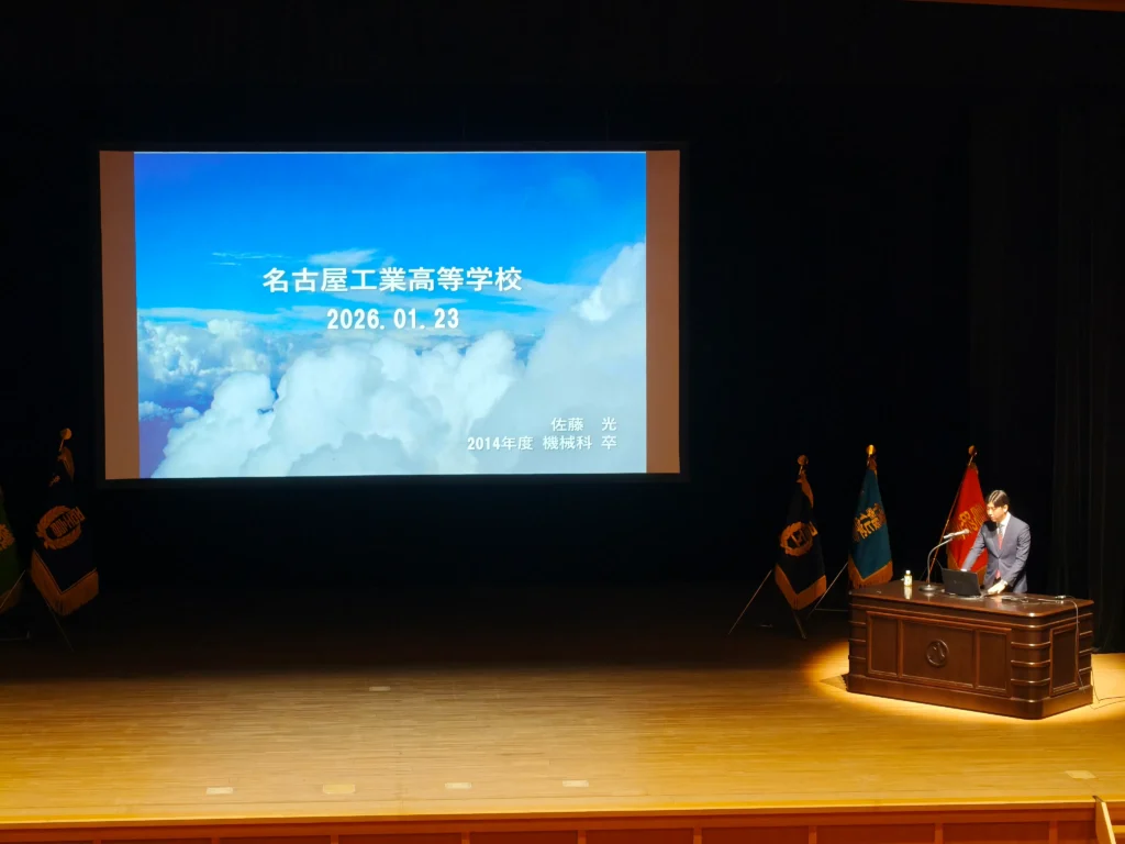 この講演会は,名工会(本校OB会)の主催で,社会人として活躍されている本校のOBの方に来ていただき,卒業してからの経歴や体験,そして現在の仕事についてお話していただき,キャリアについて考えてもらう会です。