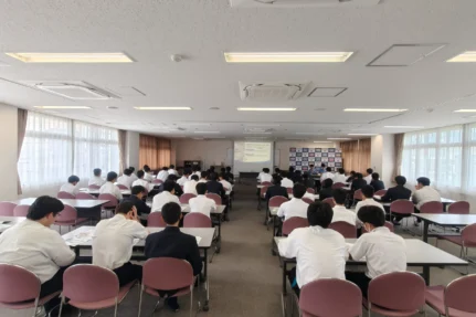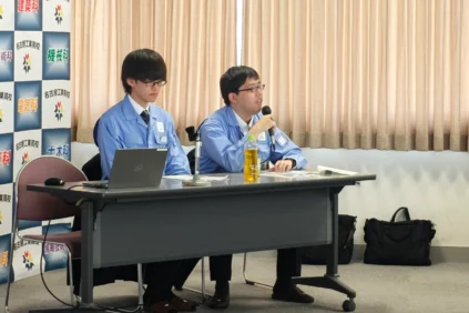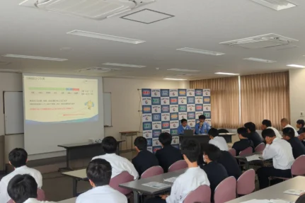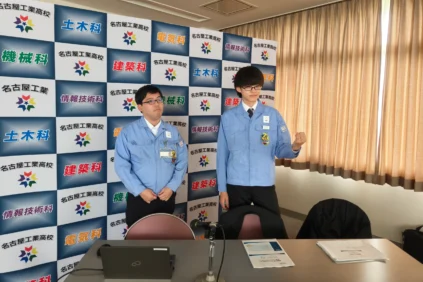 今回お迎えした講師は,2017年情報技術科卒の日紫喜久克さんと2020年電気科卒の田中春翔さんです。お二人とも月島ジェイテクノメンテサービス株式会社にお勤めです。