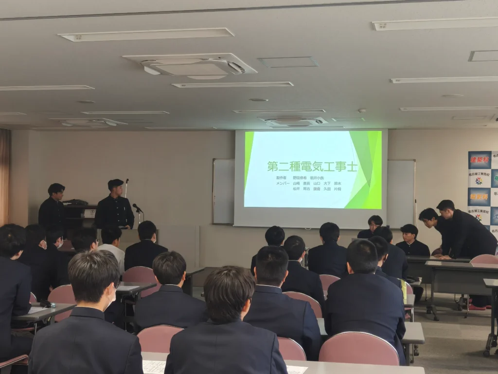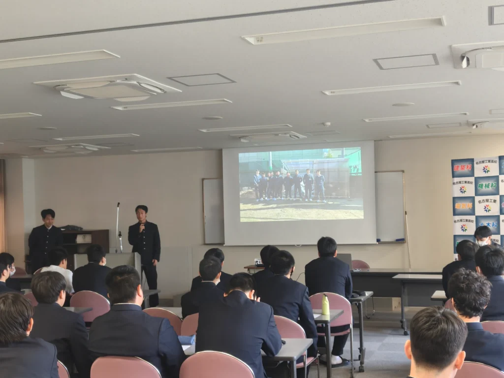 建築科・土木科の3年生では,課題研究という授業が週に3時間あります。各先生方の個性が出る授業で,木材加工で家具を作ったり,左官をやったり,建築模型を作ったり,コンピュータでゲーム開発をしたり,土嚢の格納庫を作ったり,第二種電気工事士の資格取得をしたりさまざまです。本日は3年生が発表し,それを2年生が聞き,来る来年度の授業で何を選択するかを考えてもらう授業です。