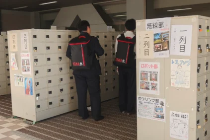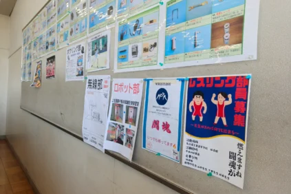 下足箱や教室の掲示板には各部活のポスターが張られています。