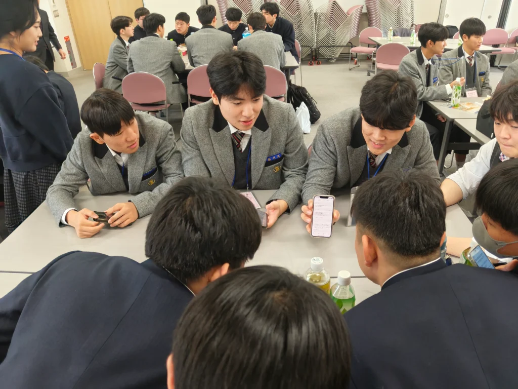 第二部では,ギョンブック機械工業高校生と名工生で班をつくり,お互いの自己紹介をしました。言葉が伝わらない中,スマホを使ってなんとかコミュニケーションをとっていました。