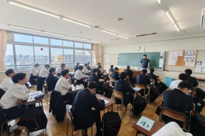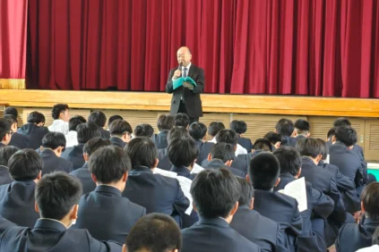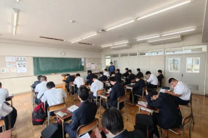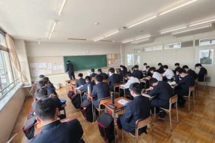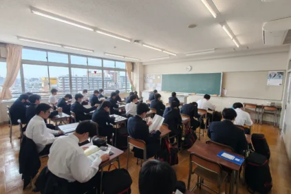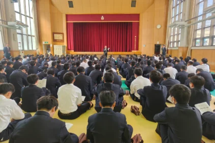さて,本日は月に1回のLHR(Long Home Room)の日で,0時間目が設定されています。2,3年生の教室では担任の先生のもと,スポーツ祭の選手を決めたりしています。1年生は柔道場にて,生活指導部長の先生から本校での生活についての説明を受けていました。