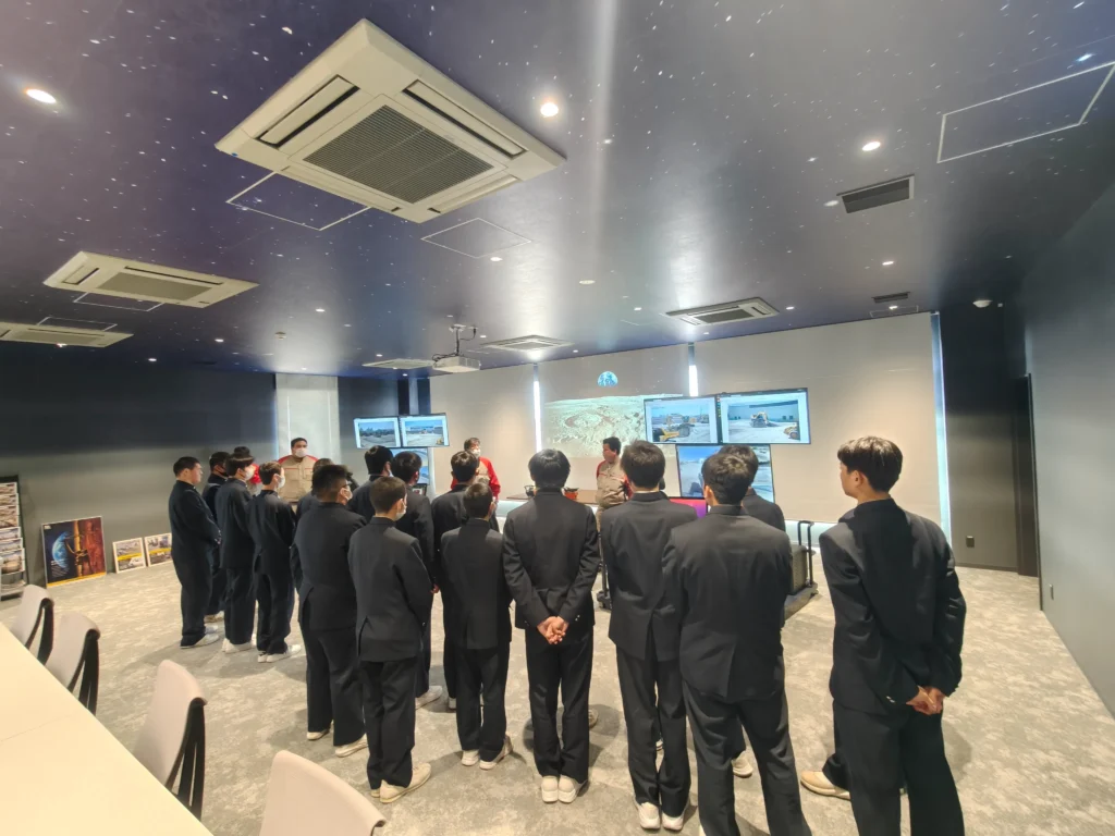 次に,遠隔操作室へ行き,実際に重機の遠隔操作の体験をしました。この部屋は月にいるような雰囲気を体験できます。カーテンを開けて,目の前の敷地にあるブルドーザーとバックホウを遠隔操作で動かします。目の前にあるモニターには動かしている重機の映像がいろいろな方向から映し出されています。外を見ても,実際の動かしている重機をみることができます。