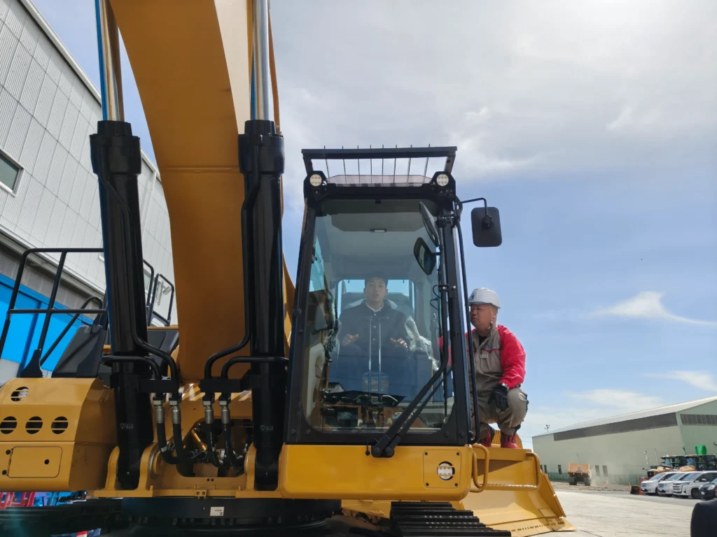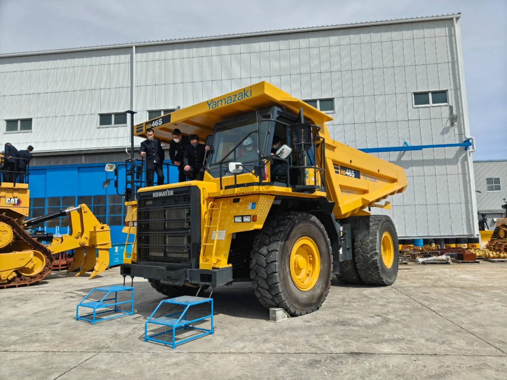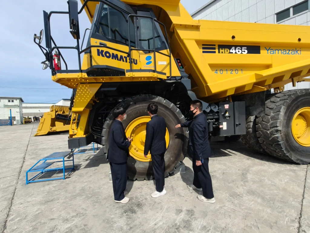 次に,外に出て,実際の大型重機の運転席に乗る体験です。山崎建設製のスクレープドーザー,キャタピラー社のバックホウ,ブルドーザー,KOMATSUの大型ダンプトラックが置いてありました。