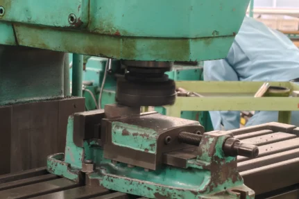 ちょうどお邪魔したとき,鋳鉄の表面を削りきれいな直方体にしているところでした。鋳鉄をフライス盤に固定し,表面を削っています。寸法通りになっているか,ノギスで長さを正確に測ります。