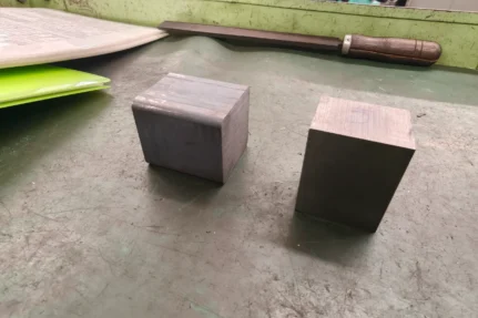 上の材料写真の左側が鋳鉄製の材料,フライス盤を使いこの表面を削り,右側の正確な直方体にしていきます。